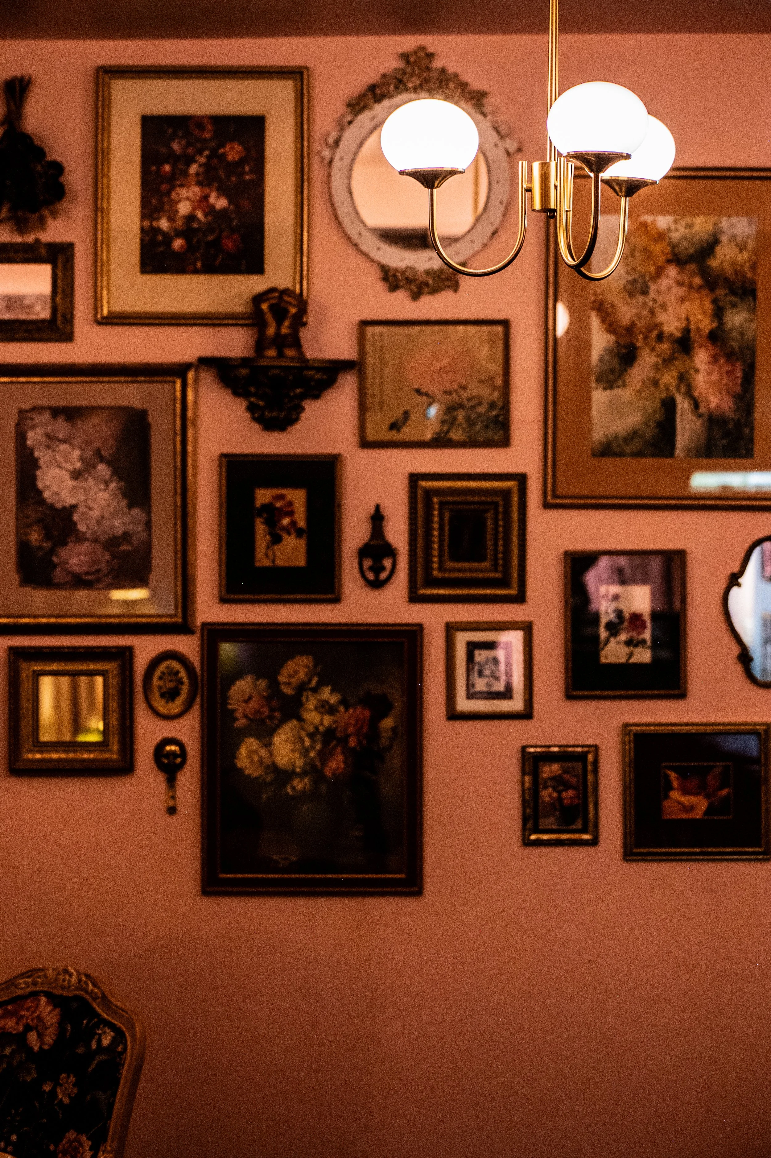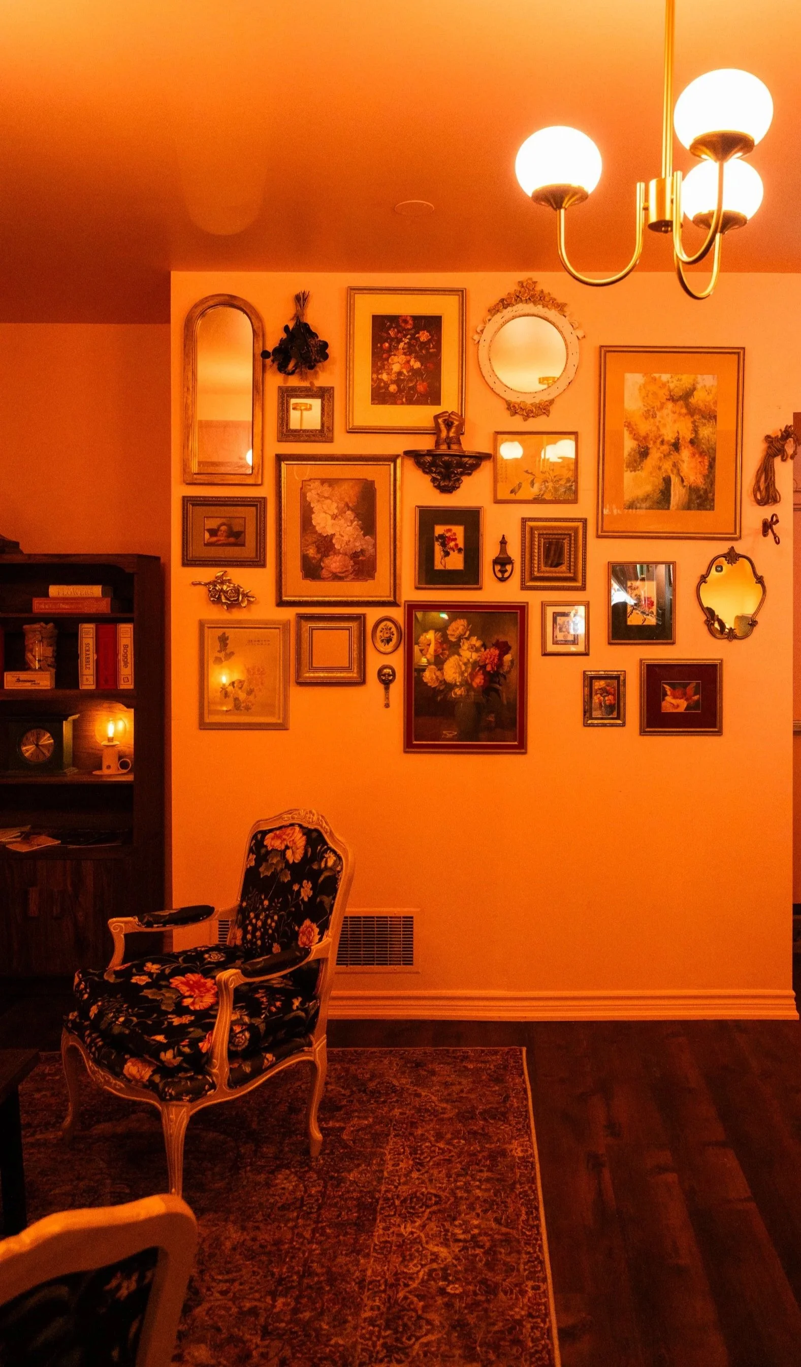A cozy living room corner featuring a gallery wall of framed artwork and mirrors, an ornate floral armchair, a dark wooden bookshelf with books and decor, and a vintage-style chandelier with three glowing globes.