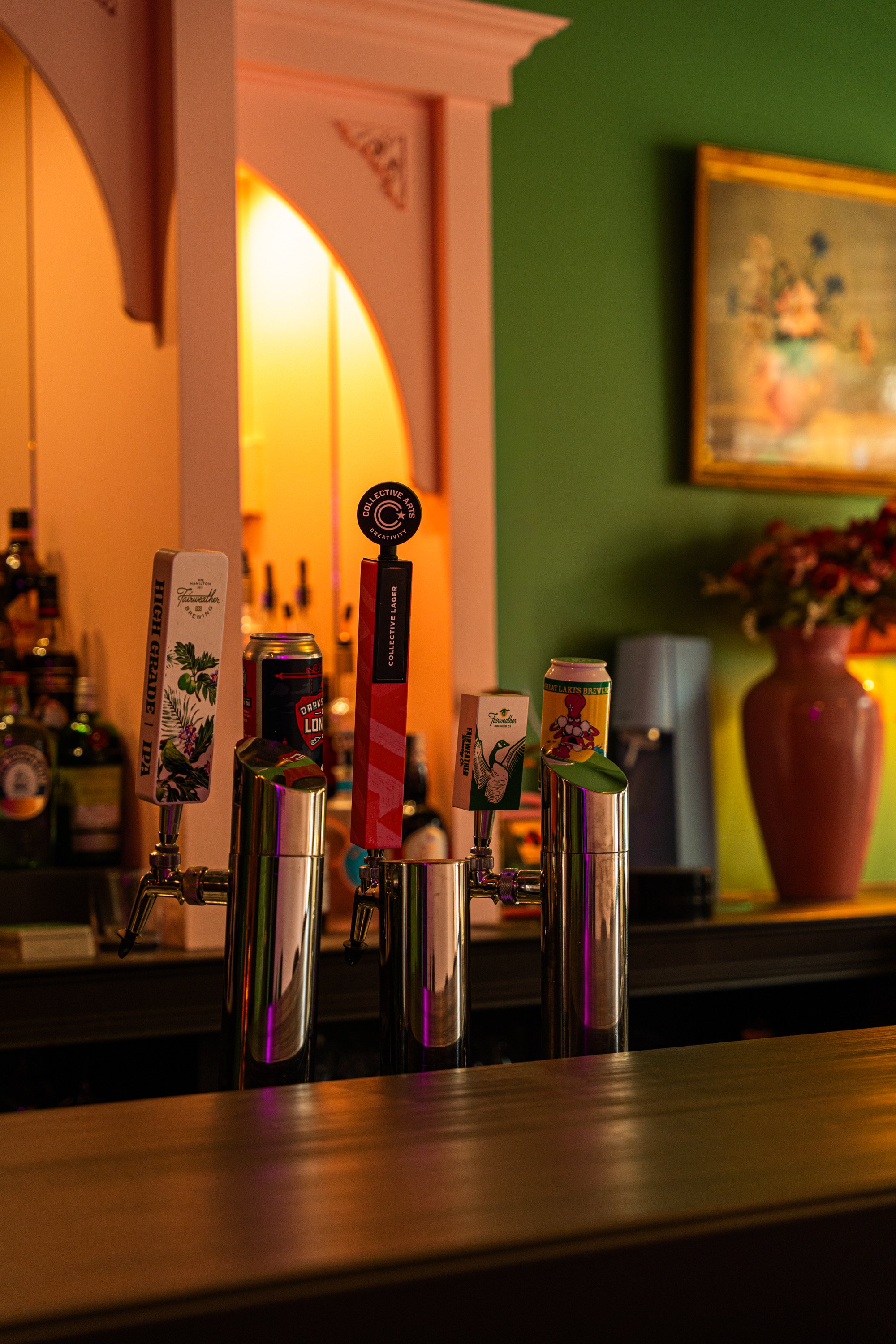 Three beer taps with colorful labels in a dimly lit bar, with a background of bottles and a painted wall.