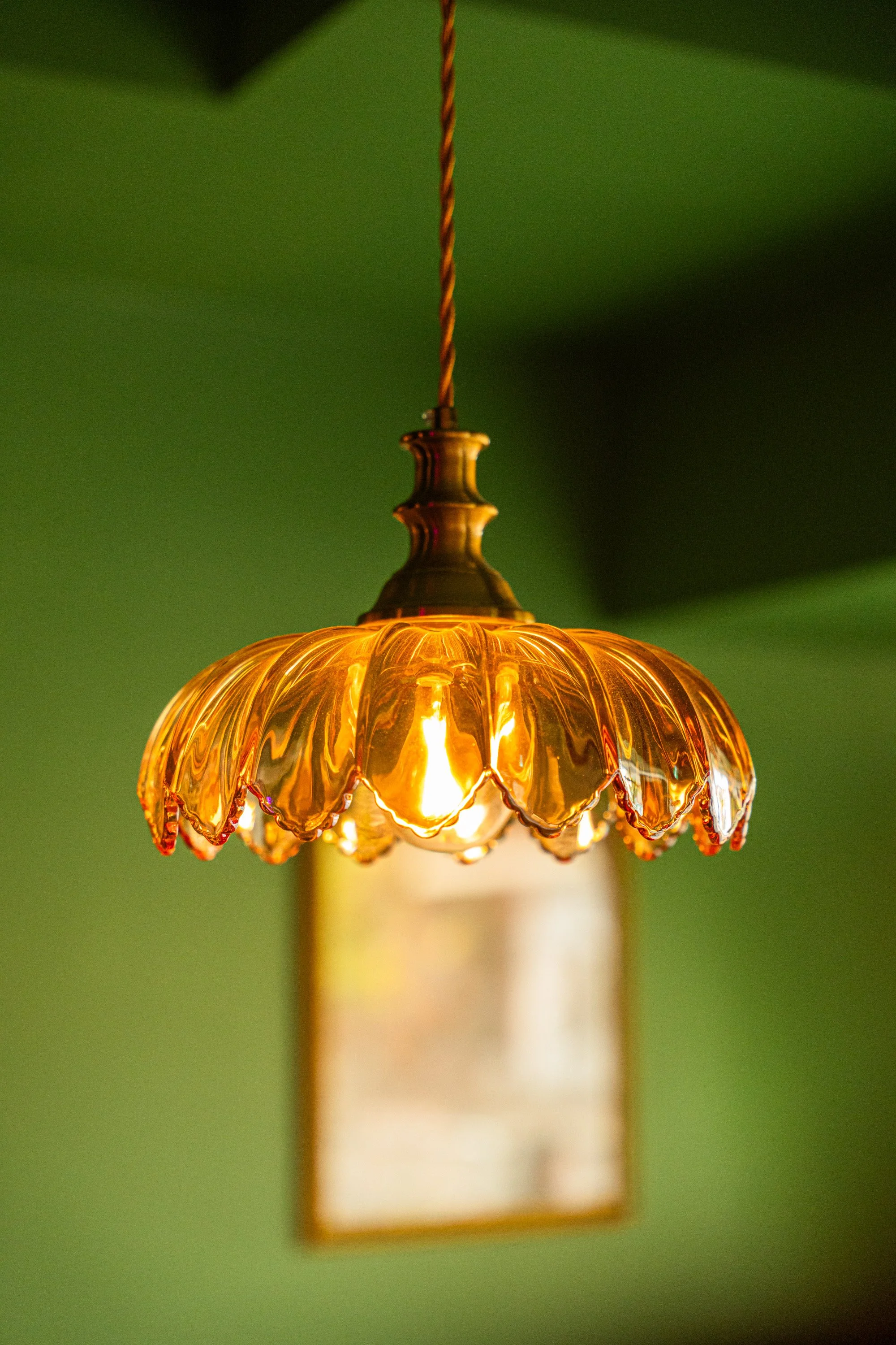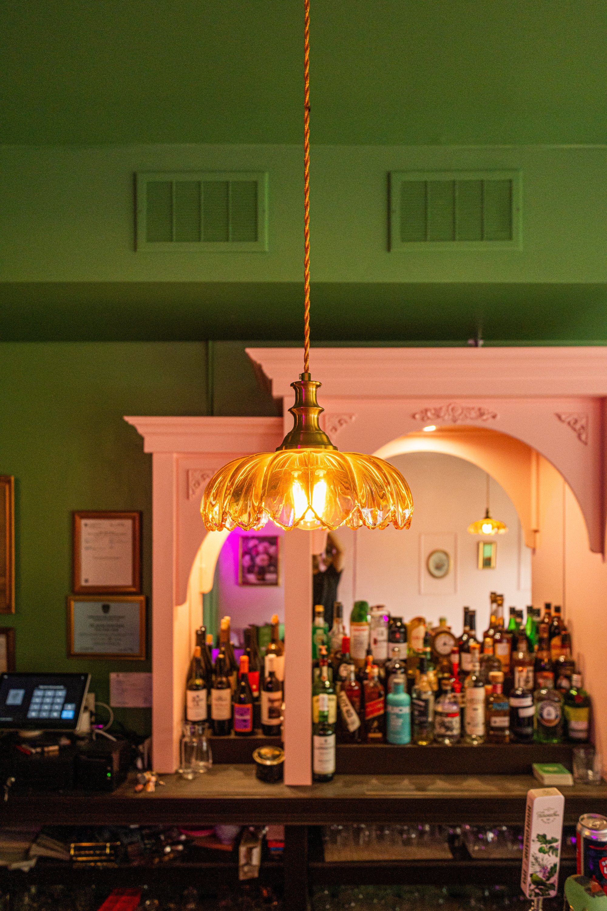 A decorative orange glass pendant light hanging above a bar with liquor bottles in the background.