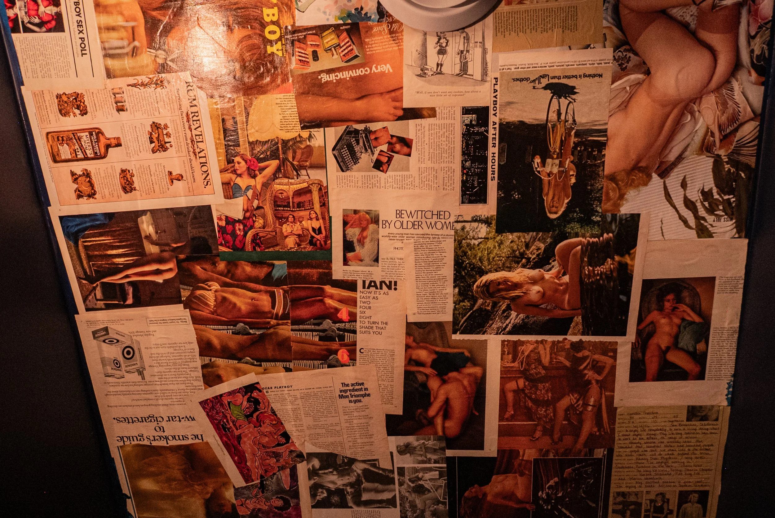 Collage of various magazine and newspaper clippings featuring images of women, advertisements, and articles, with some images of people in swimsuits and outdoor settings.